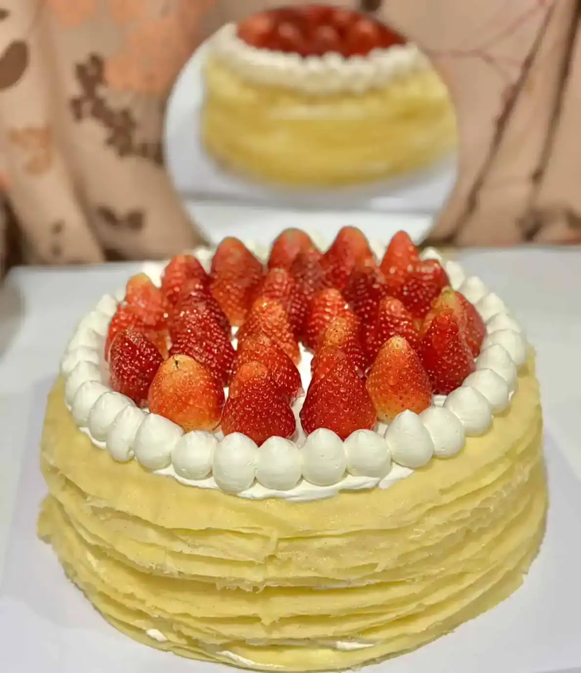 ในแต่ละชั้นเครป เราใช้แป้งที่ตีจากไข่ไก่สด แป้งพรีเมียม และนมสดจากฮอกไกโด นำมาปรุงอย่างแม่นยำ ทำให้เนื้อแป้งเครปมีความเหนียวนุ่มแต่บางเฉียบ เป็นสัมผัสที่แตกต่างจากเค้กทั่วไปโดยสิ้นเชิง และยังช่วยให้ครีมซึมซับเข้าไปในแต่ละชั้นได้อย่างสมดุล