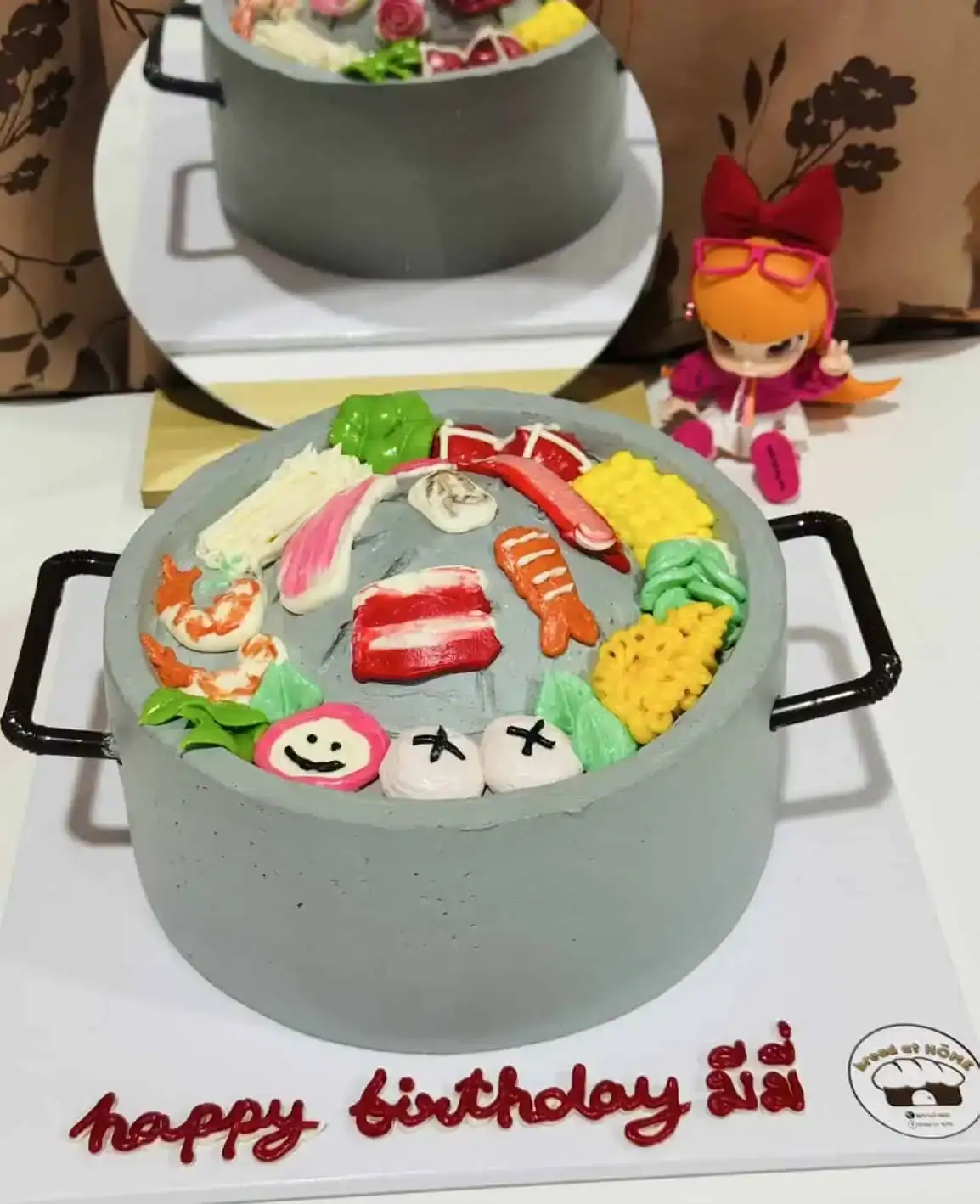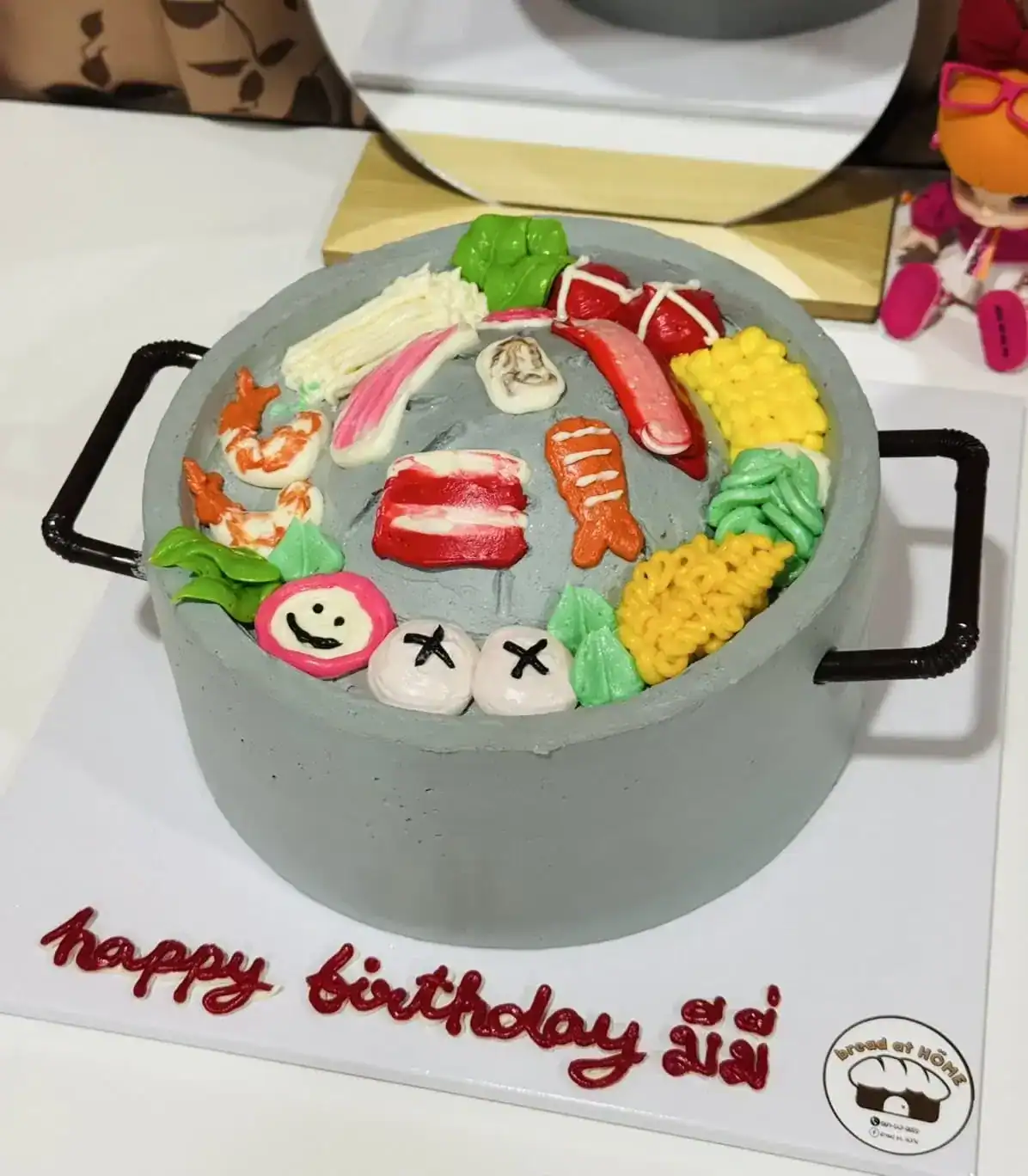ที่สร้างสรรค์ขึ้นให้มีรูปลักษณ์เหมือนชุดหมูกระทะทุกประการ เพื่อสร้างความประหลาดใจและความสนุกสนานในงานเฉลิมฉลองต่างๆ การนำหมูกระทะมาจัดวางในรูปแบบ “เค้ก” เพื่อความแปลกใหม่ เหมาะสำหรับฉลองวันเกิดหรือโอกาสพิเศษของสายกินหมูกระทะ